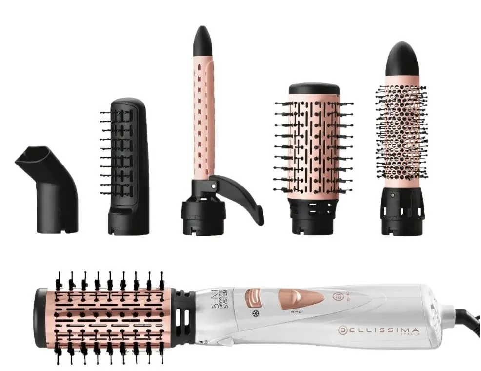 Descubre todo lo que puedes hacer con el moldeador Bellissima My Pro GH18 5 en 1 de 1000W. Diseñado para secar y dar forma al cabello al mismo tiempo, te permite conseguir acabados de salón sin salir de casa. Gracias a sus cinco accesorios intercambiables, podrás alisar, crear ondas, aportar volumen o definir tu estilo con total facilidad.